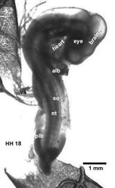 At stage HH19 the embryos have both wing and leg buds, with the leg buds being slightly larger than the wing buds. They have 37 to 40 pairs of somites that extend to the tail. Embryos at stage HH20 have 40 to 43 pairs of somites, nearly symmetrical wing buds, and asymmetrical leg buds. In this stage, the rotation process is complete, and the eyes begin to show a light grayish pigmentation.
