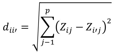 The Euclidian distance, which is a common measure for grouping data, was employed to measure similarity between groups. This measure of distance is perfectly metrical since it is a straight line between two points. It is defined as the geometric distance between two objects i and i’, taken in a space with p dimensions, according Equation 1.