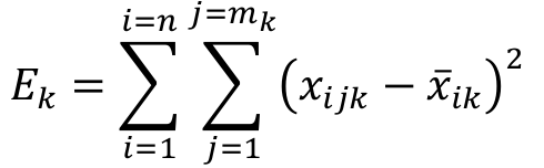 Equation 3 determines the internal error between all rates of n components of mk vectors of a given group k with regard to the average rate of the group. Further, Equation 4 determines the total error of all k groups.