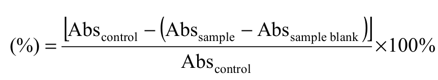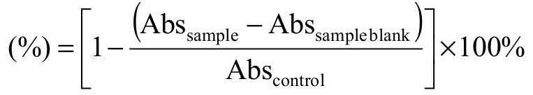 The DPPH scavenging activity of the diluted extracts (100, 50, 25 and 12.5 µg mL-1) was measured according to the method described by Duan, Zhang, Li, and Wang (2006). The absorbance of sample, sample blank and control was measured at 517 nm, after 30 min. incubation in the dark at room temperature, using a Biochrom Asys UVM340 microplate reader (Cambridge, UK). The sample consisted of the mixture of DPPH methanolic solution (0.16 mM, 1 mL) with each diluted extract (1 mL). The sample blank was prepared with 2 mL of each diluted extract, while the control was prepared with 2 mL of DPPH methanolic solution (0.16 mM). The percentage of DPPH scavenging activity was calculated using the expression below, where Abs is absorbance at 517 nm, according as equation 1.