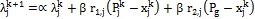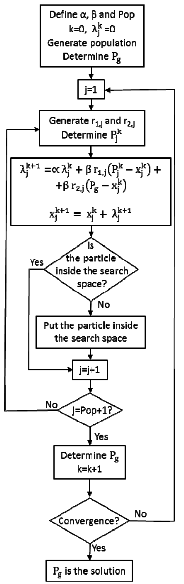(8)In Equations (7) and (8), the inertial parameter α and the learning parameter β controls the update process of the particles, while the stochastic characteristic of the method is introduced by r1,j and r2,j, which are random numbers within the range [0, 1] with uniform distribution. The superscript k identifies the optimization process iteration. Pjk is the best candidate solution found in the history of the particle j and Pg is the best candidate solution in the population (Colaço et al., 2006). The evolution process of the population is repeated until the stopping criterion is satisfied.