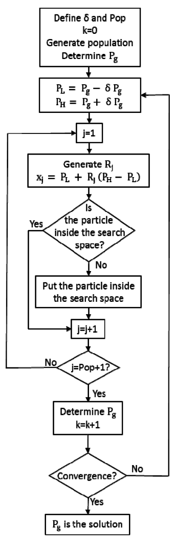 R2W is based on a random population of possible solutions, which is generated in a restricted region of the search space. The best candidate solution of the population is found and the population is discarded. Then, a new random population is created in a limited region of the search space around the last best candidate solution. This procedure is repeated until the stopping criterion is satisfied (Bihain et al., 2012).