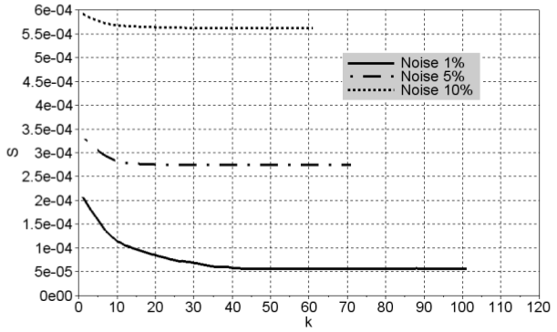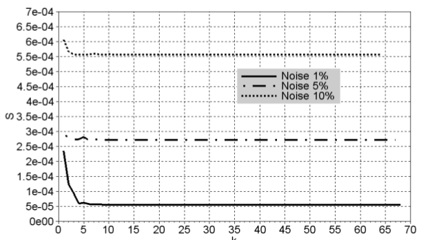 The noiseless cases have converged, satisfying the discrepancy principle. Otherwise, for 1, 5 and 10% of simulated random noise, the convergence was reached when negligible variations of the objective function during 60 consecutives iterations were verified. Such strategy has conducted to higher objective function values for the cases with noise, but has permitted the convergence.