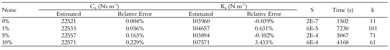 (14)In Equation (13) and (14) the subscript exact refers to the proposed numerical solution obtained with the exact values of the suspension parameters Kb and Cb Moreover, w is a random variable with normal distribution, zero mean and unitary standard deviation, E is an arbitrary noise level (Machado & Orlande, 1998; Ozisik & Orlande, 2000).