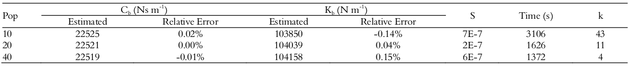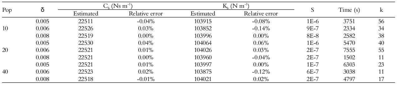 The influences of PSO empirical constants on the estimation of the suspension parameters were investigated for noiseless pseudo-experimental data. Simulations with β equal to 1.2, 1.5, 1.8 and 2.0 and with α equal to 1.0 were performed, but they have not converged. Furthermore, the influence of the population size on the inverse problem is summarized in Table 4, considering β=1 and α=0.5.
