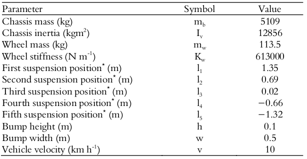 Table 1 furnishes the values of the constants for the half car model adopted in the present work, which are based on the M113 armored vehicle (Ata & Oyadiji, 2014).