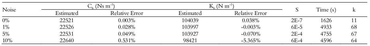 The results shown in Tables 3 and 4 reveal that the relative error between the exact values of the suspension parameters and the estimated ones are minor than 0.16%. Thus, the proposed inverse problem approach, employing PSO and R2W, with noiseless pseudo-experimental data, has estimated correctly the suspension parameters.
