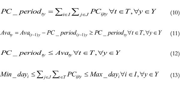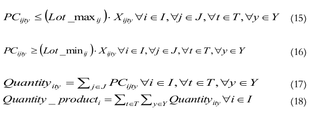 These same binary variables help to define the amount of product (dried clothes) produced by each piece of equipment, since the amount must be null whenever a piece of equipment is not being used for a specified product i and it must not exceed the capacity nor be lower than an acceptable minimum for each type of dryer. The maximum (capacity) and minimum amount for each dryer j is defined as the maximum and minimum lot size for each product of type i.