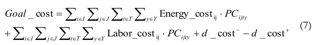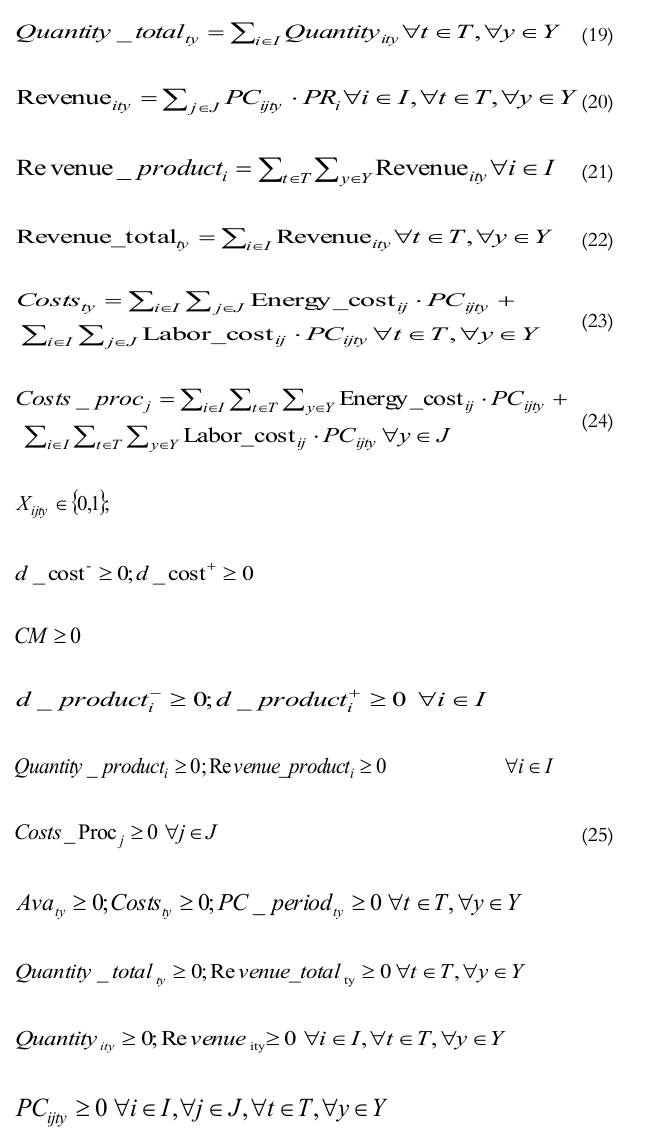As shown in Equation (6), the quantity of processed material of a type of product for all periods must be equal to the specified goal, with corrections by the positive and negative deviations. The cost goal must be equal to the sum of all costs, corrected by the deviations, according to Equation (7).