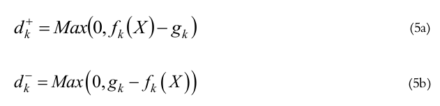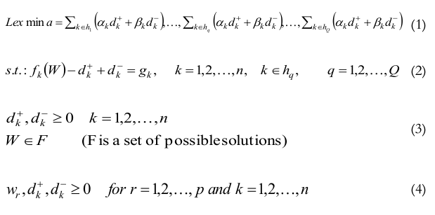 hq represents the index set of goals at the qth level of priority, wr are the elements of vector W, and alphak and behtak are positive weights related to positive and negative deviations of the kth goal, which are given by Equations 5(a) and (b).