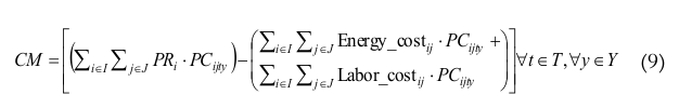 Some constraints must be written in order to correctly model the problem. The global contribution margin (CM) for processing all i products, by means of all j machines, is calculated for each period t of any day y, according to Equation (9).