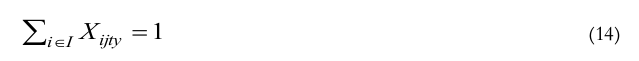 Furthermore, only one type of clothes can be processed in each dryer j for each period t of day y (Equation 14).