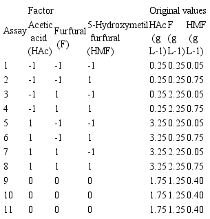 Fermentation assays were performed according to a 23 full factorial design with three replicates in the central point (Table 1) to evaluate the influence of the mixture of inhibitors on xylose bioconversion into ethanol by P. stipitis. Inhibitors (acetic acid, furfural and 5-hydroxymethyl furfural) were added in concentrations according to the literature and experimental data with sugarcane bagasse pretreatments. Fermentation processes were carried out in a rotator shaker at 30°C and 150 rpm for 72h. The ethanol yield factor (YP/S), ethanol productivity (QP), and cell yield factor (YX/S) were taken as responses of the experimental design. Statistical analysis of the data was carried out with Statistica 6.0.
