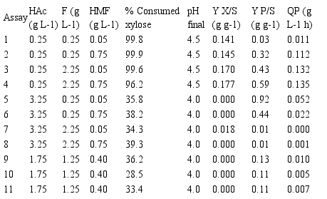 Results indicate that experiments 1 to 4, with lower concentrations of acetic acid, had an almost complete consumption of the substrate, maximum ethanol production around 48h, with a decline in subsequent intervals. In experiment 4, the highest concentration of furfural inhibited the process, with the xylose uptake initiated after 48h. In experiments 5 and 6, with high acetic acid concentration and a low concentration of furfural, substrate uptake started after 24h. Assay 6, with a higher concentration of HMF, was less influenced by ethanol. Assays 7 and 8, with higher concentrations of furfural and acetic acid, did not show growth and ethanol production, with a consumption of approximately 36% of the substrate. The central points, with the medium concentration of the inhibitors, showed slow rate of xylose consumption during the first 40 hours without growth and ethanol production.