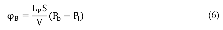 S V-1 (cm-1) is surface area per unit volume for transport in the tumor; Lp (cm mm-1 Hg-1 s-1) hydraulic conductivity of the microvascular wall; Pb (mm Hg-1) blood pressure, Pi (mm Hg-1) interstitial pressure, σs (mm Hg-1), average osmotic reflection coefficient for plasma proteins; πb (mm Hg-1), osmotic pressure of the plasma; and πi (mm Hg-1), osmotic pressure of the interstitial fluid.