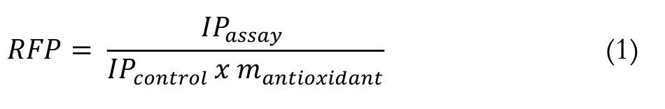 The relative protection factor (RFP) was determined from the ratio between the oxidative stability of the biodiesel containing the antioxidant and the control sample and mass of the antioxidant (Equation 1).