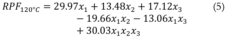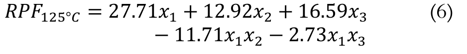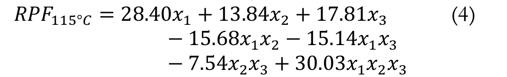 The simplex-centroid experimental design, consisting of 7 assays with two replicates at the central point, was used to assess the RFP on the synthetic antioxidant TBHQ (x1), BHT (x2) and BHA (x3) added to the biodiesel obtained from refined soybean oil without synthetic antioxidant. The responses of the mixture design are in Table 2. The cubic models with only significant terms, represented by Equations 3, 4,5 and 6 were obtained by applying the simplex-centroid design, at the test temperatures 110, 115, 120 and 125°C, respectively. The adjusted coefficients of determination (R2aj) for the equations were 0.9981, 0.9972, 0.9975 and 0.9991, respectively.