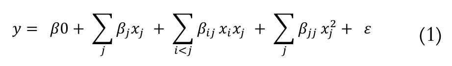 where y is the predicted response (concentration of butyl butyrate); β0 is the global mean; βj is the linear coefficient; βij is the coefficient of interaction; βjj is the quadratic coefficient; ε is the error of the model; xi and xj are coded rates of independent variables. The coded and non-coded rates of variables are shown in Table 1. Experimental data were analyzed with Statistica 8.0 (Statsoft, Inc., Tulsa, OK, USA). Analysis of variance (ANOVA) tables were generated and the effect and regression coefficients of individual linear, quadratic and interaction terms were determined. The significances of all terms were judged statistically according to the p-value at 5% significance level. Fit quality of the model equation was expressed by the coefficient of determination R2 and its statistical significance was determined by F-test.