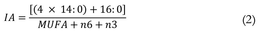 The nutritional quality of lipids can be verified through the omega-6-to-omega-3 (n6/n3) fatty acids ratio and the polyunsaturated-to-saturated fatty acids ratio (PUFAs/SFAs) (Souza, Bentes, Simões, & Fontenelle, 2008). However, Santos-Silva, Bessa, and Santos-Silva (2002) recommend evaluating the nutritional quality of the fatty acid profile based on the functional effects of the fatty acids, such as the hypocholesterolaemic-to-hypercholesterolaemic ratio (h/H), index of atherogenicity (IA) and index of thrombogenicity (IT).
