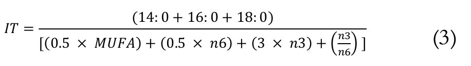 The IT considers myristic (14:0), palmitic (16:0) and stearic (18:0) as thrombogenic, and PUFAs (omega-6 and omega-3) and monounsaturated fatty acids (MUFAs) as antithrombogenic, with n3 fatty acids providing the greatest effect (Ulbricth & Southgate, 1991). The IA relates pro- and antiatherogenic acids. IT and IA indicate the potential for stimulating platelet aggregation, i.e., the lower the IT and IA values, the greater the antiatherogenic fatty acid content in a given oil/fat and, consequently, the greater the potential of preventing coronary diseases (Turan, Sönmez, & Kaya, 2007).