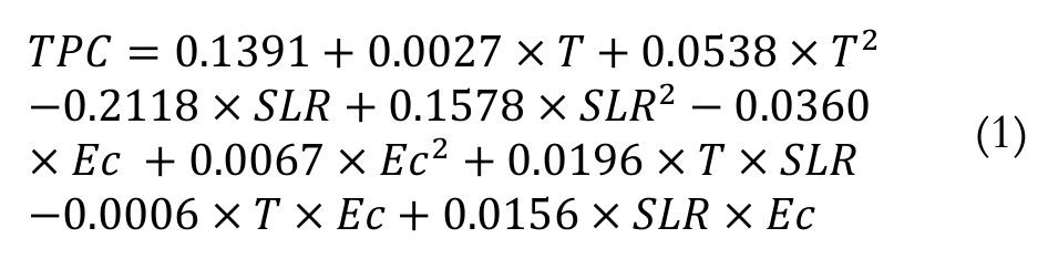 Equation 1 shows a quadratic model (TPC as a function of the coded independent variables) based on the analysis of the effects: