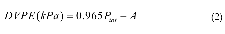 The Dry Vapor Pressure Equivalent (DVPE) of blends was determined in a Grabner Instruments MINIVAP VPS, according to ASTM D5191 standard method. For the test, the sample was aspirated and introduced into a test chamber, thermostatically controlled at 37.8°C (100 F) with the vapor-liquid maintained at 4:1 ratio. DVPE results, in kilopascals (kPa), were automatically calculated by the chamber´s total pressure (sample + air dissolved partial pressures), according to Equation 2. Analyzes were performed in triplicate.
