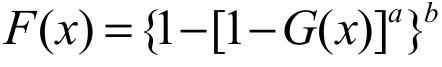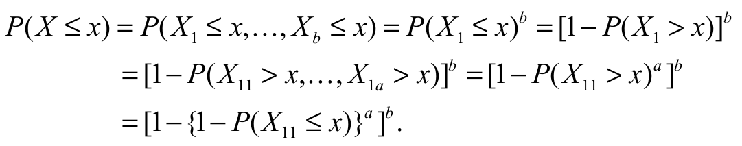 (7)where > 0 and b > 0. The two extra parameters and in the density Equation 7 can control both tail weights, enabling the generation of flexible distributions, with heavier or lighter tails, as appropriate. There is also an attractive physical interpretation of the model Equation 7 when and are positive integers: Suppose initially that a certain device is composed of components in a parallel system. Consider also that, for each component , there exists a series of subcomponents independent and distributed according to the SGu model. Suppose also that each component b fails if some subcomponent fails. Let Xj1, …, Xja denote the lifetimes of the subcomponents within the j th component, j = 1, …, with common cdf SGu. Let Xj denote the lifetime of the j component and let X denote the lifetime of the device. Hence: