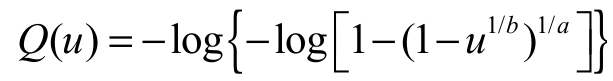 (8)where u (0,1). There are many important practical applications for Equation 8. For example, occurrences of the random variable X can be easily obtained from a uniform random variable U by X = Q(U). Next, we use Equation 8 to simulate 200 EGSGu (3, 2) occurrences. Figure 1 gives the EGSGu (3, 2) pdf, histogram, exact and empirical cdfs for these simulated data.