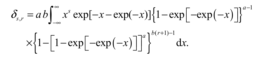 Table 3 gives from Equation 15 the values of s,r for X ~ EGSGu(a, b) and some values of s and r. All computations are performed using the ‘Wolfram Mathematica Software’. Based on the values in Table 3, we conclude that, for fixed r, the PWMs increase when s increases. The opposite happens when we fix parameter s and r increases.
