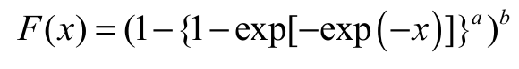 (5)respectively, for x IR. The goal is to show that our simplified version of the EGGu model has great power of fit to real data and good simulation properties, with the advantage of having only two parameters. Therefore, we define the exponentiated generalized standardized Gumbel (EGSGu) distribution by inserting Equation 4 into Equation 2. The cdf F(x) and pdf f(x) of the EGSGu distribution are given by Equation 6 and 7: