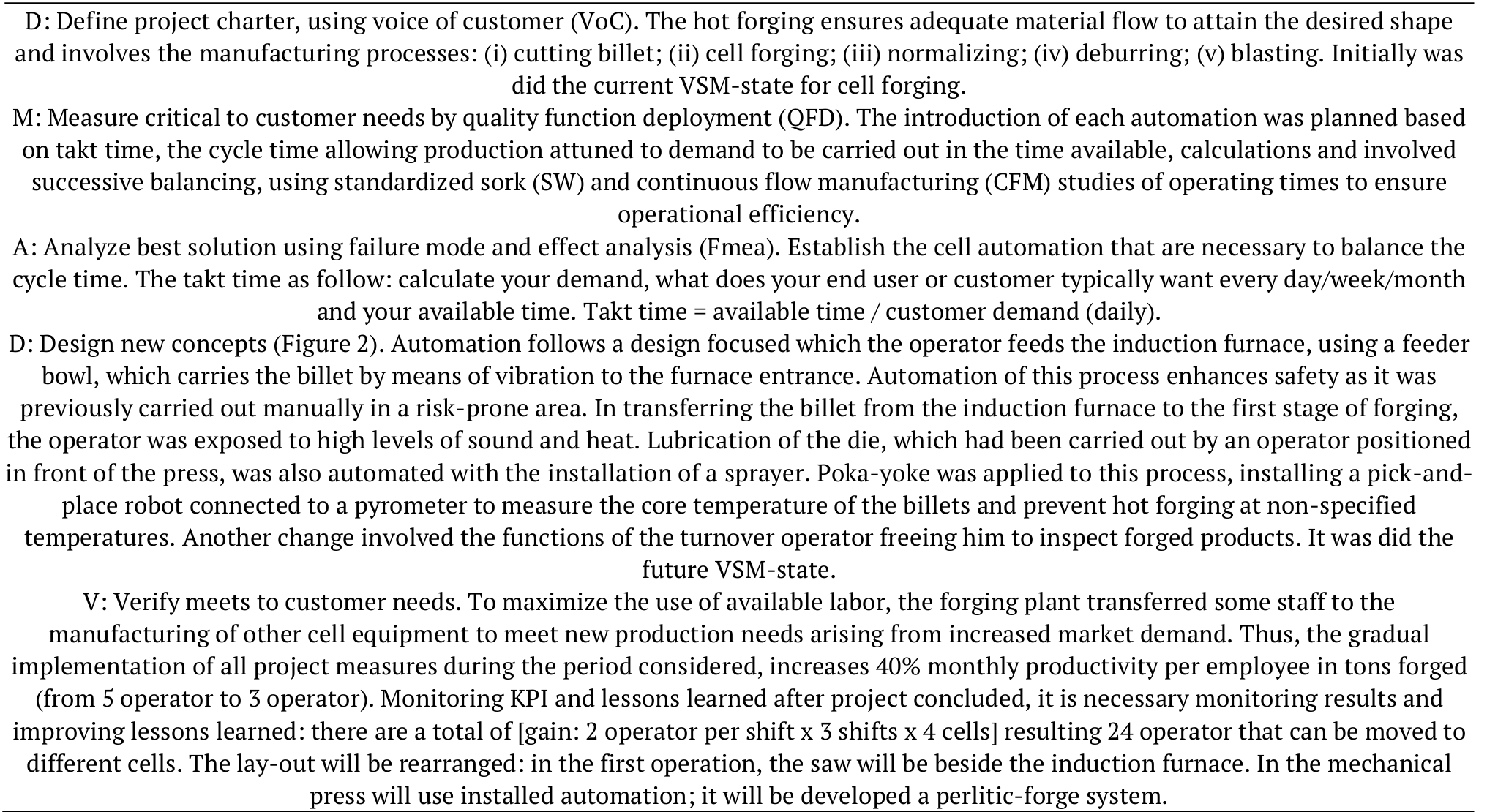 Hot forging cell automation (VSM/Dmadv) select personnel, risk and attractiveness analyses, project charter on the project in a forging business unit is about hot forging cell automation. It uses functional structure described in the framework and it defines: forging impact; goal, innovation, establish project charter (goal: reduce labor 35% by 04/15/2016; team: black belt (leader), engineer, operator; stakeholders: shareholders, customers, suppliers, employees, society; limitation of scope: robot application, and scheduling (Gantt: Define: 01-03/2015; Measure: 02-06/2015; Analyze: 04-07/2015; Design: 05-11/2015; Verify: 10/2015-04/2016). Table 10 shows Dmadv cycle.