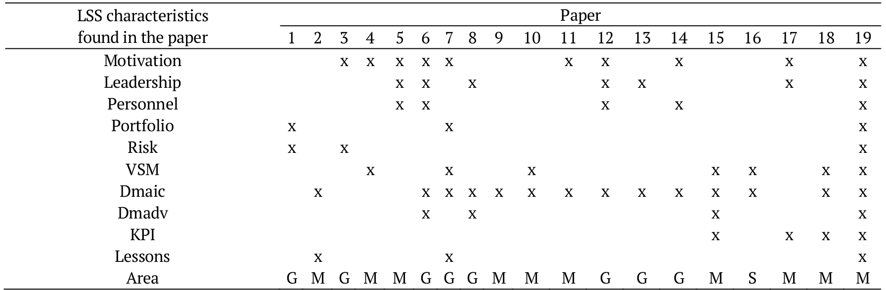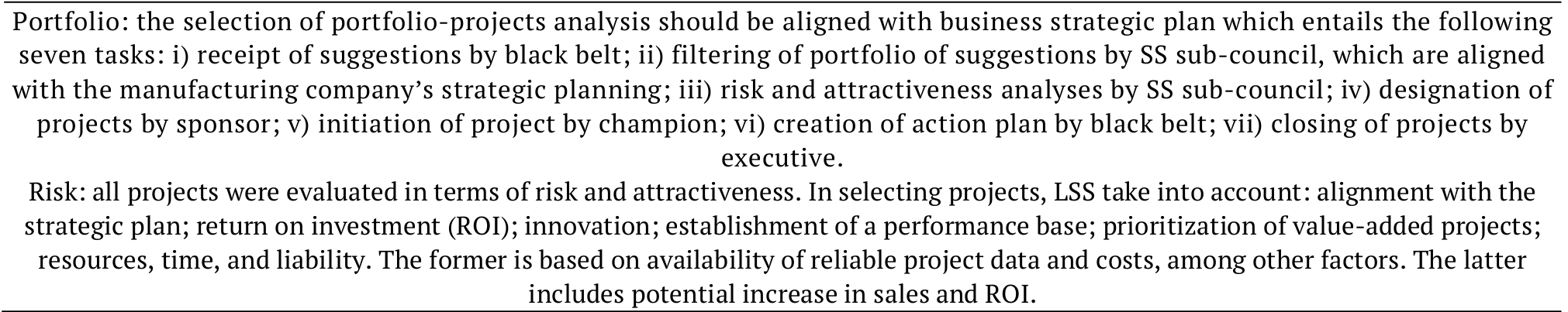 In the systematic review of the literature performed in the present work we found papers that provide frameworks and characteristics for LSS. However, none of them, at the same time, presented a functional structure that manages projects in manufacturing and engineering, elaborates risk analysis, selects projects in line with manufacturing strategic planning, implements VSM combining Dmaic or Dmadv, monitors the return on investment for a year, disseminates lessons learned.