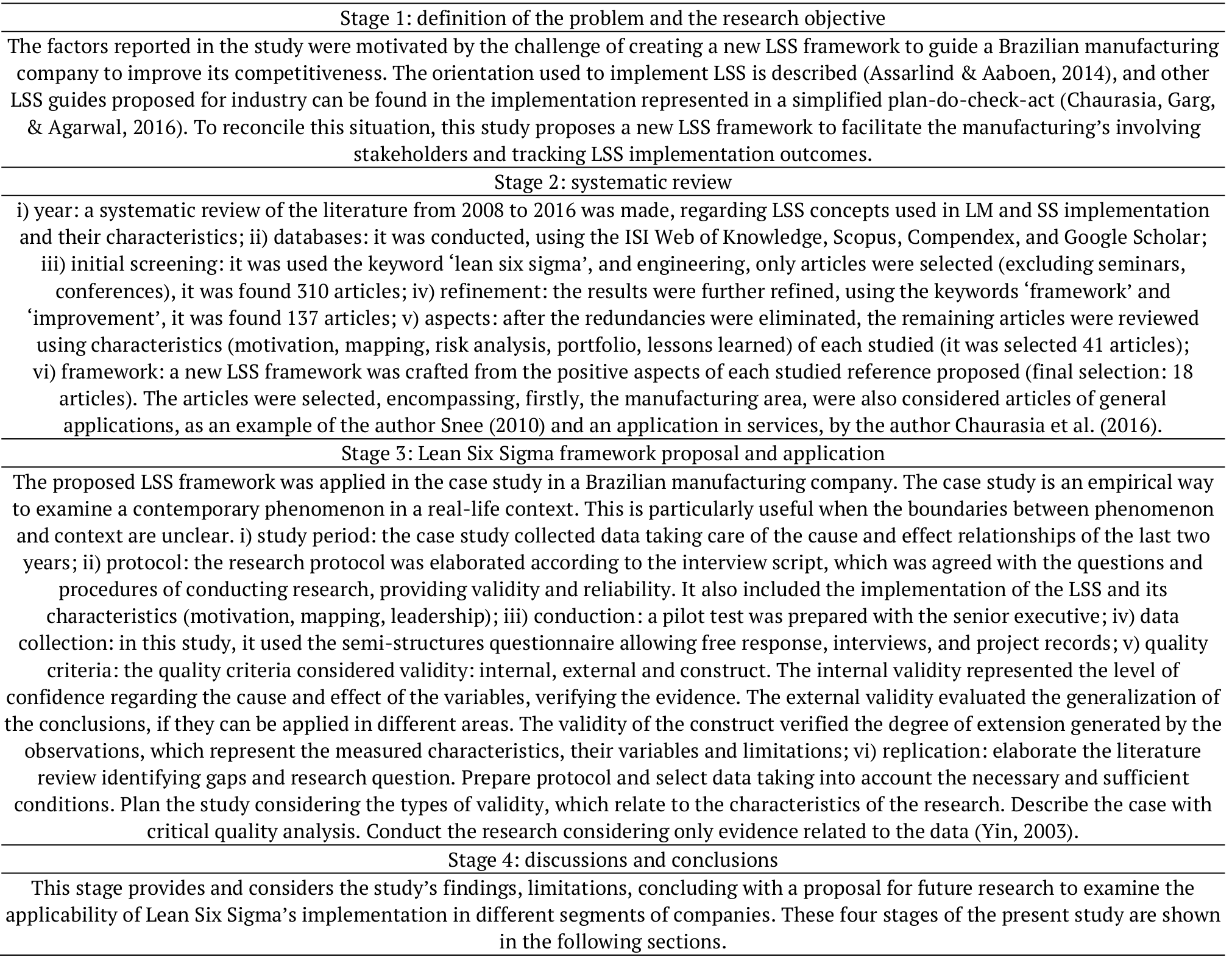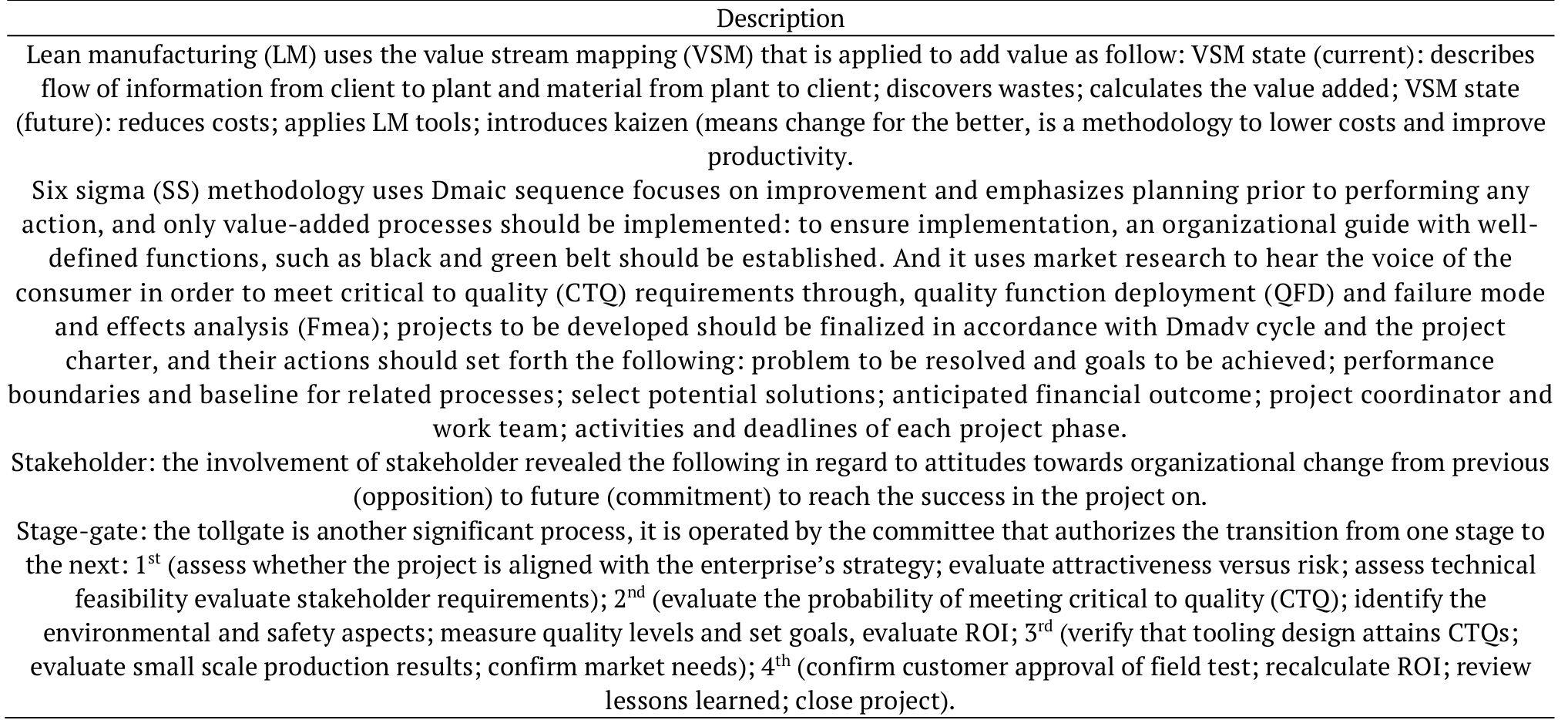 The challenge of manufacturing management to introduce innovations in the manufacture of products entails not only the design and implementation of new methods but also organizational changes and the involvement of human resources (Thürer, Godinho Filho, Stevenson, & Fredendall, 2015). A key to innovation is the application of methodologies aimed at improving manufacturing, as well as processes such as lean manufacturing focusses on reduction of lead time and six sigma a well-established approach that looking for eliminate defects, which complement each other as Lean Six Sigma (LSS) (Godinho Filho & Utiyama, 2016). The combination of LSS is beneficial because it compensates for limitations in their components (Shokri, Shirley, & Nabhani, 2016). In addition, it is important for practitioners to be aware of LSS implementation processes, in view of limitations and impeding characteristics such as motivation (Albliwi, Antony, & Lim, 2015; Freitas & Costa, 2017).