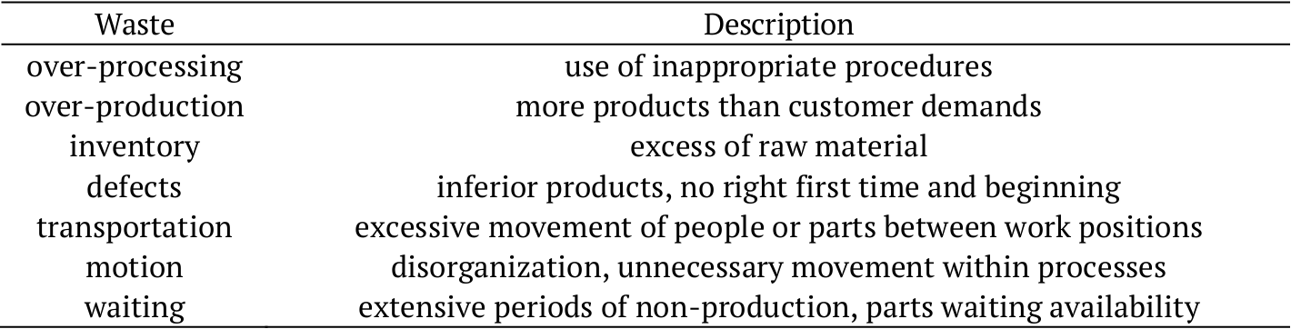 Lean manufacturing (LM) gained prominence in the 1980s as the result of a research project by the Massachusetts Institute of Technology, which studied practices adopted by leading companies in the automotive supply industry and found that the following LM practices significantly contributed to increased competitiveness (Bhamu & Sangwan, 2014). The Lean principles are (Womack & Jones, 2003; Snee, 2010): (i) identify value; (ii) measure the value; (iii) pull on customer demand; (iv) create value; (v) achieve perfection. For identify and measure the value, LM uses value stream mapping (VSM) to depict the entire process on a single page. VSM enables visualization of the transmission of information from the client to the plant and the flow of material in the process and thus facilitates to add value, and the discovery and eliminate of waste (Table 2).