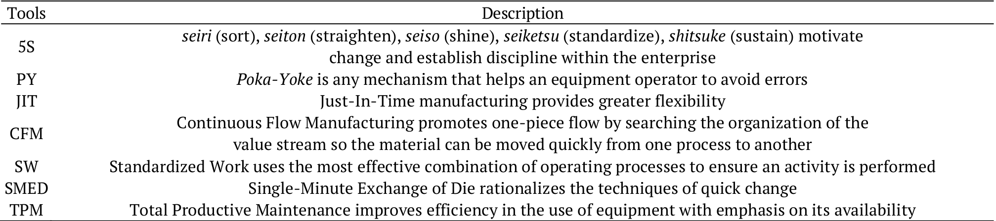 Table 9 shows the application of the tools applied in the case study. In this table the tools are separated by their origin methodology, either LM or SS.