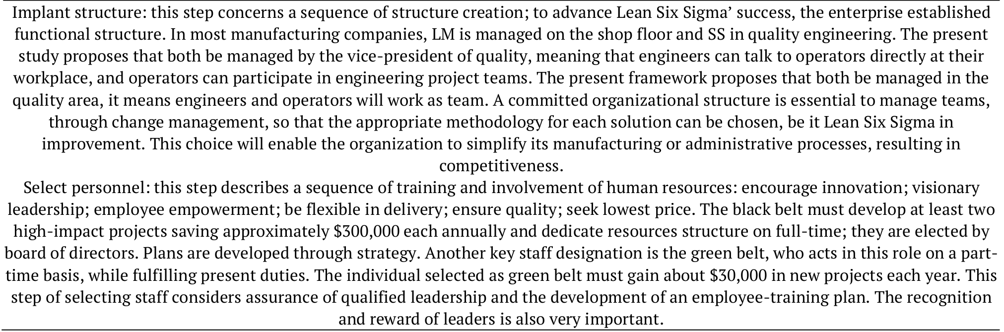 Phase 1 (Establish organization): in the proposed LSS framework the initial phase is to select key personnel, including the black belt, who must be a leader with extensive experience in working on projects, capable of motivating staff to participate actively in changing organizational culture (Table 4).