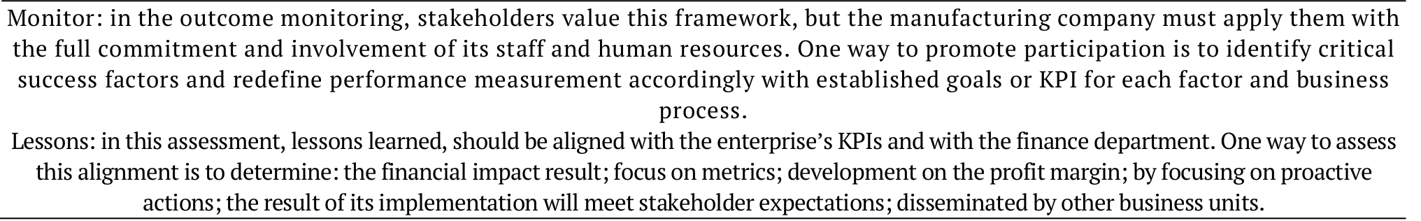 Phase 4: Monitor projects: this phase monitors the indicators and disseminates the results to other business units (Table 8).