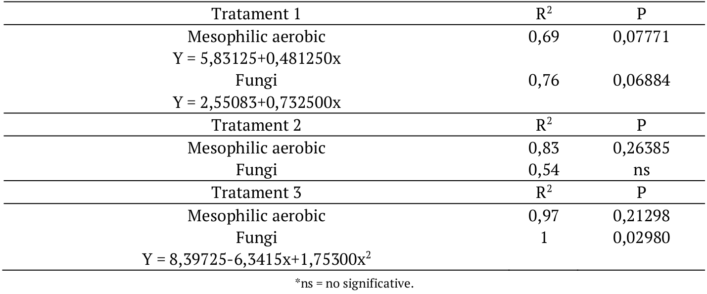 For the microbiological evaluation of aerobic mesophilic bacteria, differences were not significant between treatments neither for the treatment x time interaction (p > 0.05), but were significant between the evaluated times (p < 0.05). The regression equations are presented in Table 1.