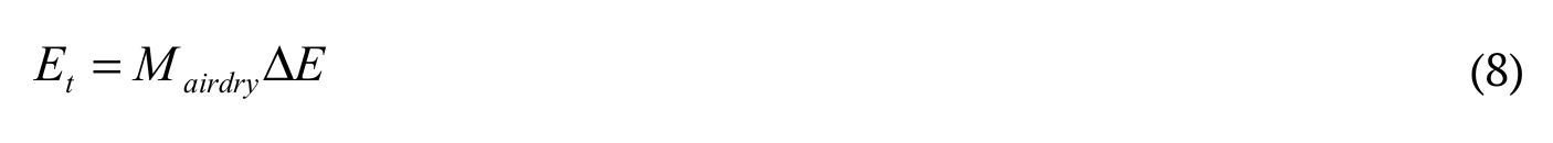 ΔE is the enthalpy change (kJ kg-1 dry air), E2 is the enthalpy of the drying air (kJ kg-1 dry air), E1 is the enthalpy of the air in the initial condition (kJ kg-1 air dry). The amount of energy required was calculated by Equation 8: