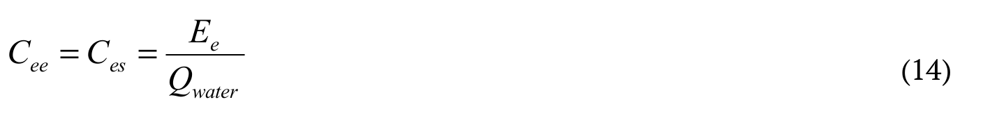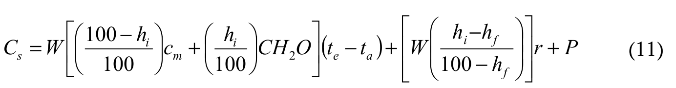 In which Ceeis the specific energy consumption (kJ kg-1), Csis the specific energy consumption in drying (kJ kg-1), Ee is the energy consumption (kJ), Qwater is the amount of evaporated water (kg of water). The amount of total water to be evaporated was calculated by Equation 15: