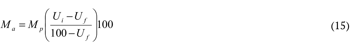 Pal is the weight of water for initial condition (kg of water), Ui is the water content (% w.b.), Pt is the total grain weight (kg of product). The mass of dry matter is given by Equation 2.