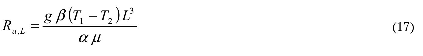 T1 is initial temperature, T2 final temperature, α coefficient of thermal diffusivity, L section length, Ra,L Rayleigh. The ermalente of ermal diffusivity was determined by Equation 18: