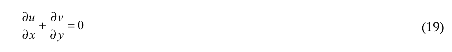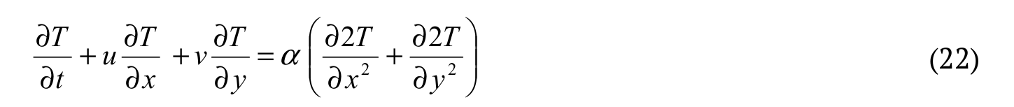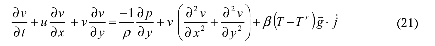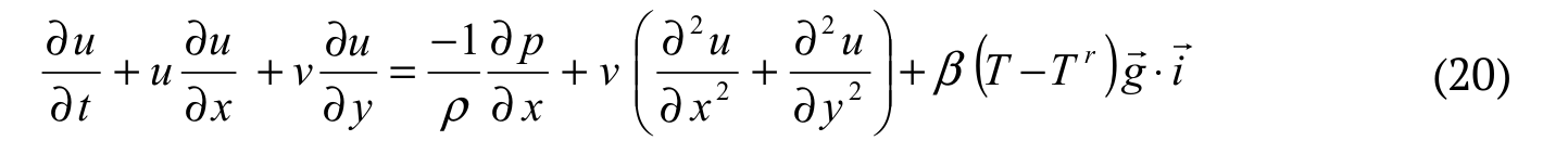 u is the velocity in the direction (x) (m s-1), v is the velocity in the direction (y) (m s-1), x is the horizontal coordinate (m), y is the vertical coordinate (m), p is the specific mass (kg m-3), δ is the gradient, β is the volumetric expansion coefficient, T is the temperature (°C), i is the unit vector in the (x) direction, J is the unit vector in the (y) direction. Equation 22 represents the conservation of energy in the system: