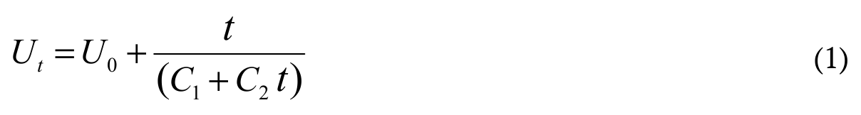 Ut is the moisture content at time t, (decimal d.b.), U0 is the initial moisture content (decimal d.b.), t is the soaking time (min.), C1 is the Peleg rate constant (min decimal d.b.-1) and C2 is Peleg capacity constant, (decimal d.b.-1). For a sufficiently long time of hydration, equilibrium moisture (Ueq) can be obtained by Equation 1 when the time tends to infinity resulting in Equation 2: