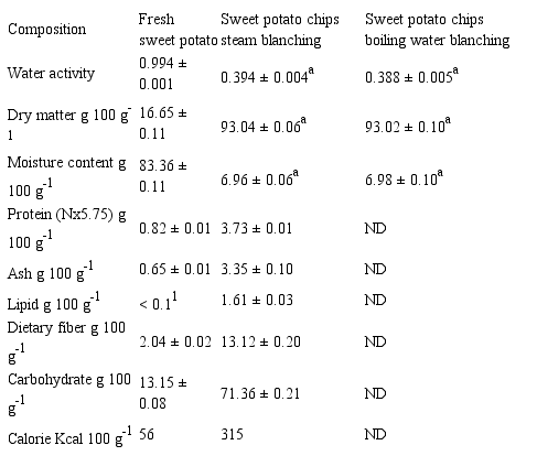 The chemical composition of the sweet potato roots without the peels and the sweet potato chips are shown in Table 1. The raw material has high moisture content (83.36 ± 0.11 g 100 g-1) and the carbohydrates are present in a larger amount when compared to the other macro-nutrients evaluated (13.15 ± 0.08 g 100 g-1).