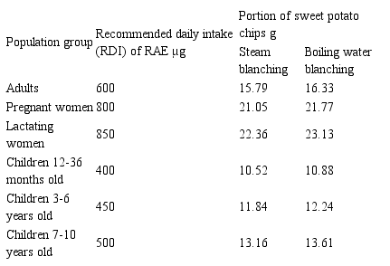 Total carotenoids, β-carotene content and RAE of fresh sweet potato, steam blanched and boiling water sweet potato chips as well as retention values of total carotenoids and β-carotene in the processing are shown in Table 3.