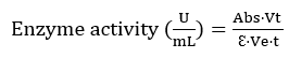 (1)where: the Abs is the absorbance from the pNP production measured at 348 nm, Vt is the total reaction volume, Ɛ is the molar extinction coefficient of the product (12.854), Ve is the enzyme volume, and t is the reaction time.