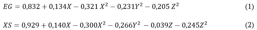 Equation 1 and 2 express the second-order quadratic reduced models constructed for endoglucanase and xylanase.