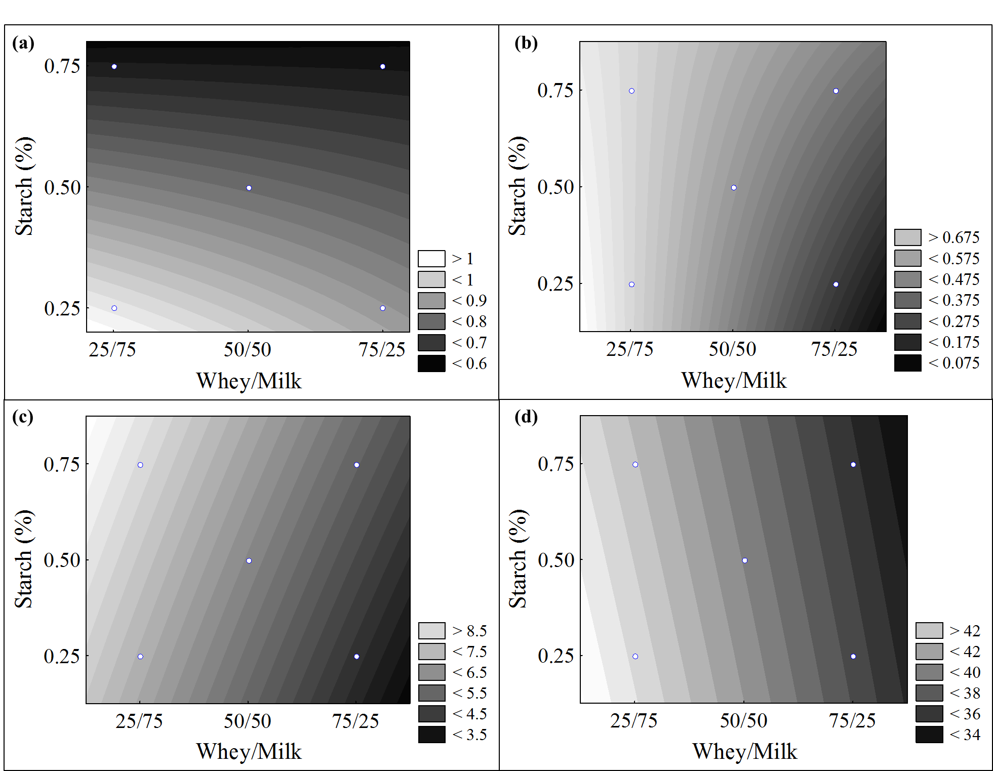 where: X1 and X2 are whey/milk ratio and starch content variables, respectively.