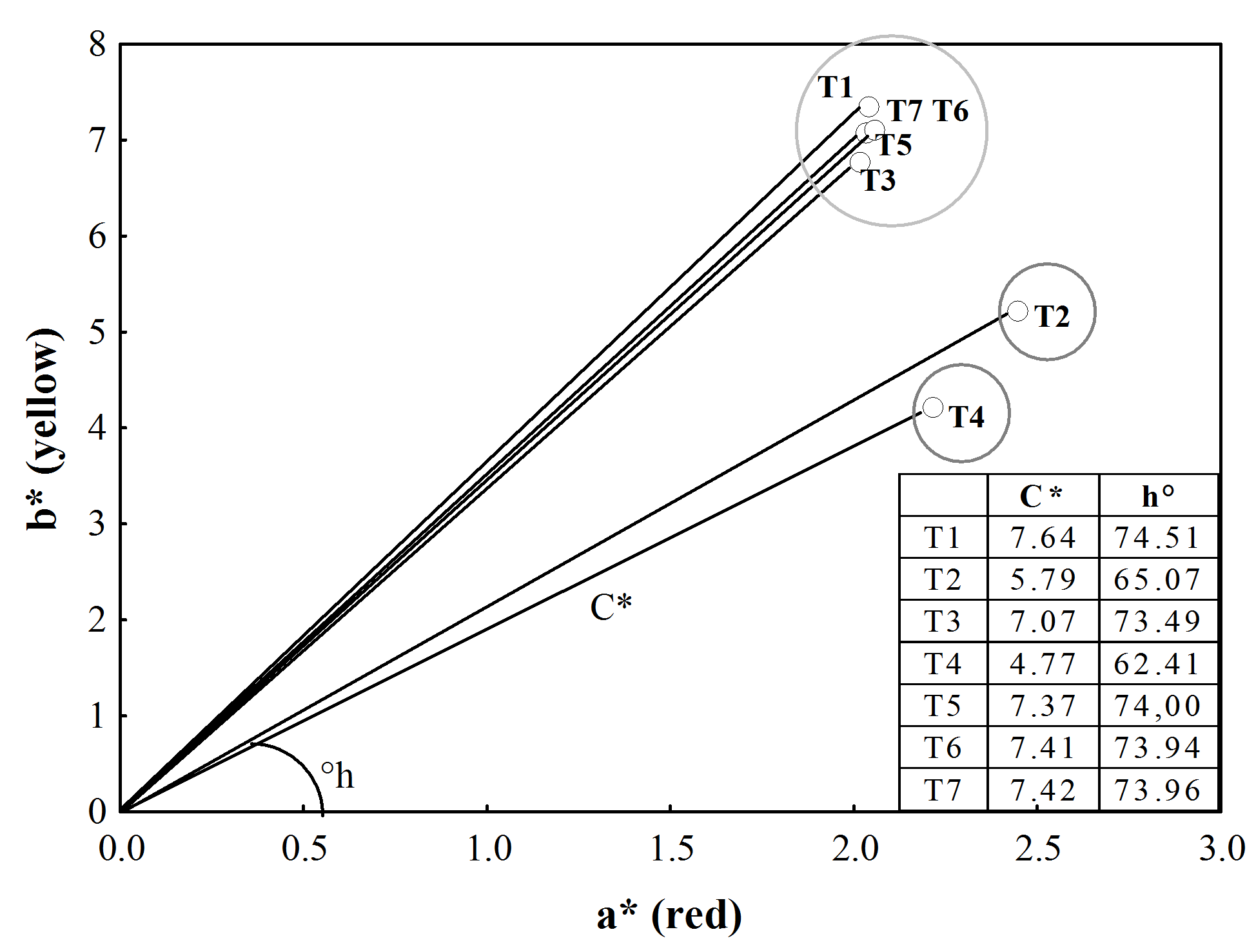 Figure 3 shows the color diagram with the C* chroma vectors and the hour color angle of the dairy beverage samples. Assays 2 and 4, with higher whey content, differed from the others (Tukey test), which presented higher values for the a* parameter and lower for the b* parameter, resulting in a lower °hour color angle. In addition, the C* values were also lower than for the other samples, which indicates that the color of samples 2 and 4 tends slightly to a reddish and less intense hue, that is, the addition of whey decreased the intensity and color tone of the dairy beverage.